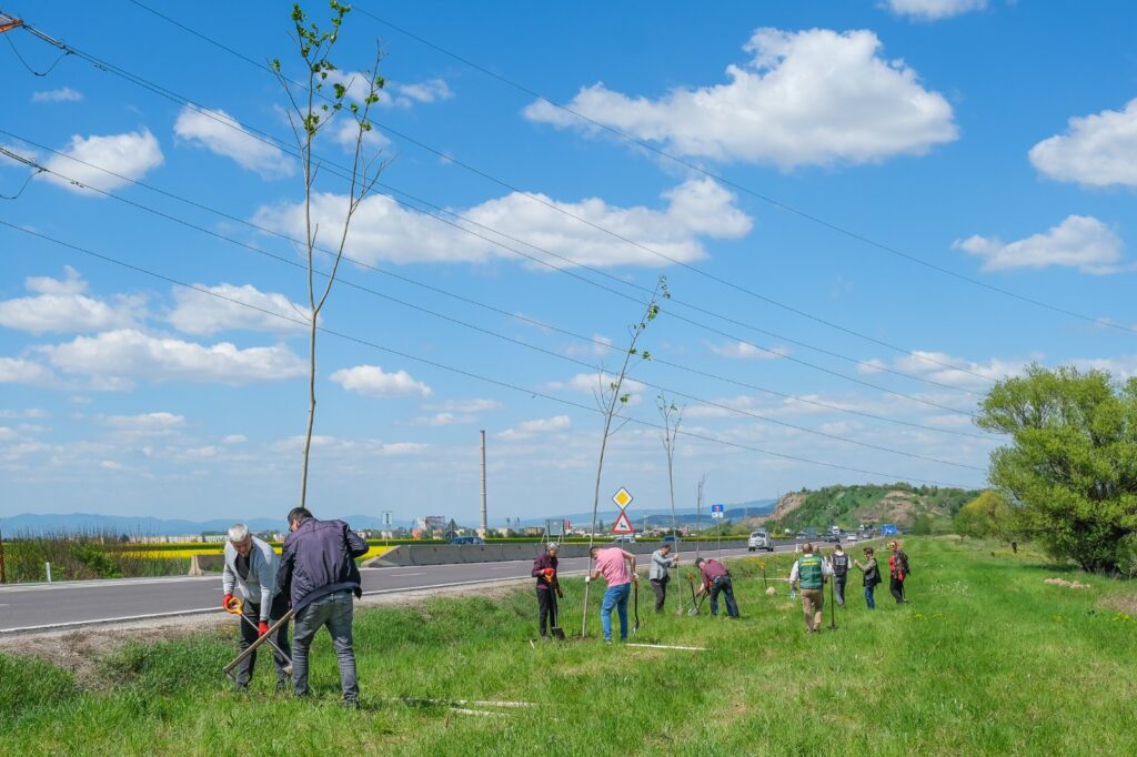 Angajații primăriei și ai instituțiilor de mediu au participat azi la crearea unui kilometru de centură verde în zona șoselei de centură a municipiului (la intersecția cu drumul de sud-est, spre cartierul Noua), prin plantarea a 100 de tei maturi și a 900 de arbuști din lemn câinesc.