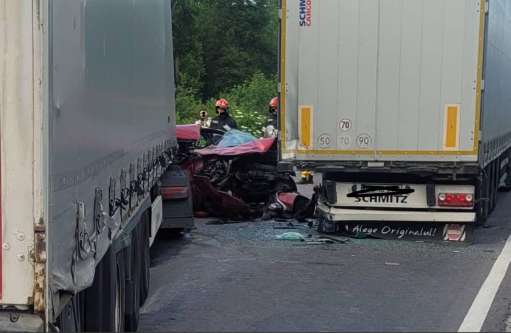 Conform imaginilor de la fața locului, un autoturism a fost zdrobit între două autocamioane, iar poliția cercetează cauzele care au dus la acest accident.