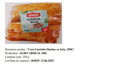Din motive ce ţin de siguranţa consumatorilor, Rewe România retrage de la comercializare şi recheamă produsul Casa Gustului Slanină cu boia, 250G, lot 183025, termen de valabilitate 13.06.2025.
