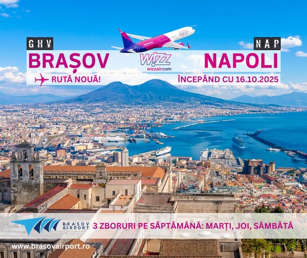 Biletele pentru zborurile spre Napoli au fost scoase la vânzare astăzi. Wizz Air va zbura, începând cu 16 octombrie, de la Brașov spre „capitala pizzei”