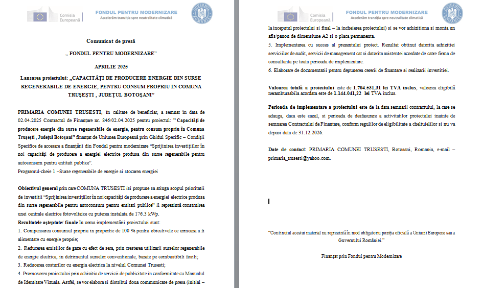 PRIMARIA COMUNEI TRUSESTI, în calitate de beneficiar, a semnat în data de 02.04.2025 Contractul de Finanțare nr. 846/02.04.2025 pentru proiectul: Capacităţi de producere energie din surse regenerabile de energie, pentru consum propriu în Comuna Trușești , Judeţul Botoșanifinanțat de Uniunea Europeană prin Ghidul Specific – Condiții Specifice de accesare a finanțării din Fondul pentru modernizare “Sprijinirea investițiilor în noi capacități de producere a energiei electrice produsa din surse regenerabile pentru autoconsum pentru entitati publice”.