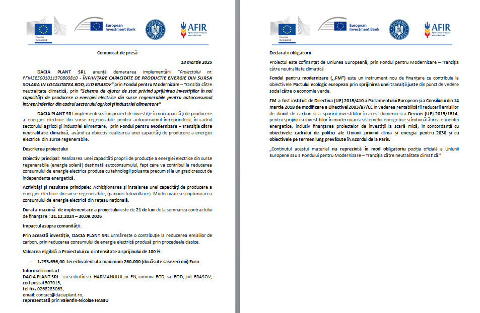 DACIA PLANT SRL anunță demararea implementării ”Proiectului nr. FFMSES001011370800810 – ÎNFIINȚARE CAPACITATE DE PRODUCTIE ENERGIE DIN SURSA SOLARA IN LOCALITATEA BOD, JUD BRASOV” prin Fondul pentru Modernizare – Tranziția către neutralitate climatică, prin ”Schema de ajutor de stat privind sprijinirea investiţiilor în noi capacităţi de producere a energiei electrice din surse regenerabile pentru autoconsumul întreprinderilor din cadrul sectorului agricol şi industriei alimentare”