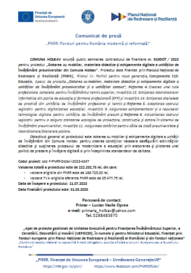 COMUNA HOLBAV anunță public semnarea contractului de finantare nr. 910DOT ⁄ 2023 pentru proiectul „Dotarea cu mobilier, materiale didactice și echipamente digitale a unităților de învățământ preuniversitar din Comuna Holbav”. Proiectul este finantat prin Planului Național de Redresare și Reziliență (PNRR), Pilonul VI. Politici pentru noua generație, Componenta C15: Educație, Apelul de proiecte „Dotarea cu mobilier, materiale didactice și echipamente digitale a unităților de învățământ preuniversitar și a unităților conexeʺ, Reforma 4. Crearea unei rute profesionale complete pentru învățământul tehnic superior, Investiția 13. Echiparea laboratoarelor informatice din școlile de educație și formare profesională (EFP) și Investiția 14. Echiparea atelierelor de practică din unitățile de învățământ profesional și tehnic și Reforma 5. Adoptarea cadrului legislativ pentru digitalizarea educației, Investiția 9. Asigurarea echipamentelor și a resurselor tehnologice digitale pentru unitățile de învățământ precum și Reforma 6. Actualizarea cadrului legislativ pentru a asigura standarde ecologice de proiectare, construcție și dotare în sistemul de învățământ preuniversitar, Investiția 11. Asigurarea dotărilor pentru sălile de clasă preuniversitare și laboratoarele/atelierele școlare.