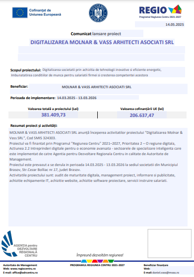 | Valoarea cofinanțării UE (lei) 206.637,47 Rezumat proiect și activități:MOLNAR & VASS ARHITECȚI ASOCIAȚI SRL anunță începerea activităților proiectului “Digitalizarea Molnar & Vass SRL“, Cod SMIS 324303.Proiectul va fi finanțat prin Programul “Regiunea Centru” 2021–2027, Prioritatea 2 – O regiune digitală, Acțiunea 2.2 Întreprinderi digitale pentru o economie avansată – sectoarele de specializare inteligență care este implementat de către Agenția pentru Dezvoltare Regională Centru în calitate de Autoritate de Management.Proiectul este prevăzut a se derula în perioada 14.03.2025 – 13.03.2026 la sediul societății din Municipiul Brașov, Str.Cezar Bolliac nr.17, județ Brașov.Activitățile proiectului sunt: audit de maturitate digitală, management proiect, informare și publicitate, achiziție echipamente IT, achiziție website, achiziție software proiectare, servicii instruire salariați. Beneficiar finanțareE-mail: [email protected]