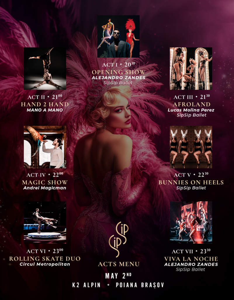 Despre eveniment: Sip Sip Lumière este continuarea seriei unice de show-uri-cabaret by Sip Sip – o experiență care îmbină energia spectacolelor de varieté cu atmosfera unui lounge exclusivist. Decoruri scenice impresionante, momente artistice captivante, costume spectaculoase și un vibe cosmopolit – totul într-un spațiu care transformă fiecare seară într-un spectacol.