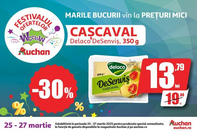Până pe 1 aprilie, magazinele Auchan te invită la Festivalul Ofertelor Wooww unde poți profita de reduceri de până la 50% la produse importante – fie că este vorba despre produse alimentare sau nealimentare, din categorii precum băcănie, băuturi alcoolice și non-alcoolice, cosmetice, produse de menaj, produse pentru copii, articole pentru animalele de companie, dar și electronice și electrocasnice.