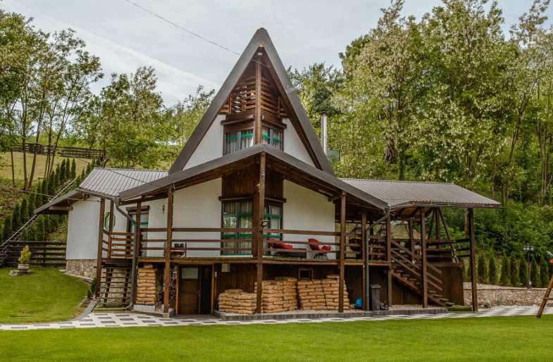 Conform Sothebys Romania, corpul principal, numit cabană, are hochoparter la care se ajunge pe o scară de lemn ce continuă ca balcon împrejmuind clădirea pe o laterală. La parter este bucătăria. La etaj și în mansardă își găsesc loc trei dormitoare; cel matrimonial, generos și luminos, se bucură de un șemineu în culorile liniștitoare ale nisipului. Camerele au tavane acoperite integral de lemn sau sunt traversate de bârne decorative ce integrează spațiul în natură.