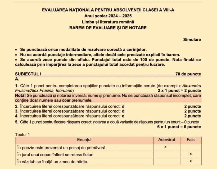 Elevii de clasa a VIII-a au susținut astăzi proba scrisă la Limba și literatura română din cadrul simulării pentru Evaluarea Națională 2025. Ca și la examenul propriu-zis, probele din cadrul simulării naționale încep la ora 9:00, moment în care, în fiecare sală, se deschid plicurile sigilate care conțin subiectul multiplicat. Timpul de lucru este de 2 ore.