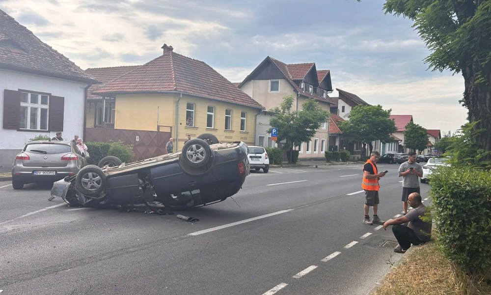 Un accident rutier spectaculos a avut loc vineri pe strada De Mijloc din municipiul Brașov. În urma impactului violent dintre două autovehicule, una dintre mașini s-a răsturnat și a ajuns cu roțile în sus pe carosabil, blocând complet traficul în zonă.
