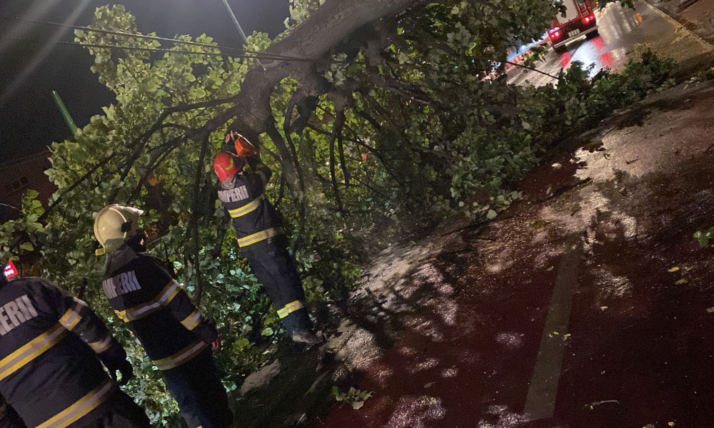 Pompierii au acționat pentru degajarea copacului și asigurarea perimetrului.