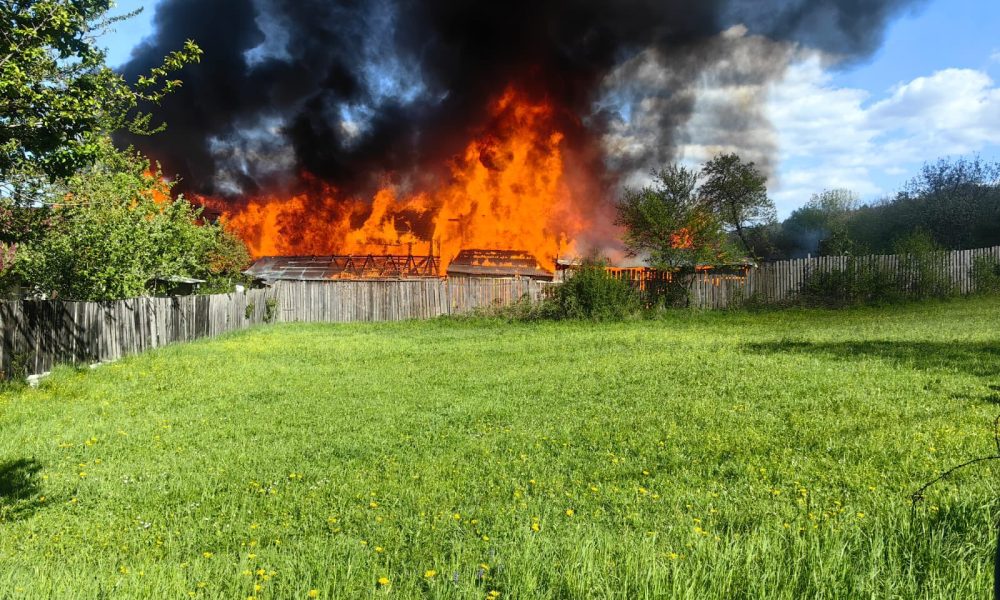 Echipajele de pompieri lucrează în continuare intens pentru stingerea completă a focului și protejarea celorlalte construcții din zonă.