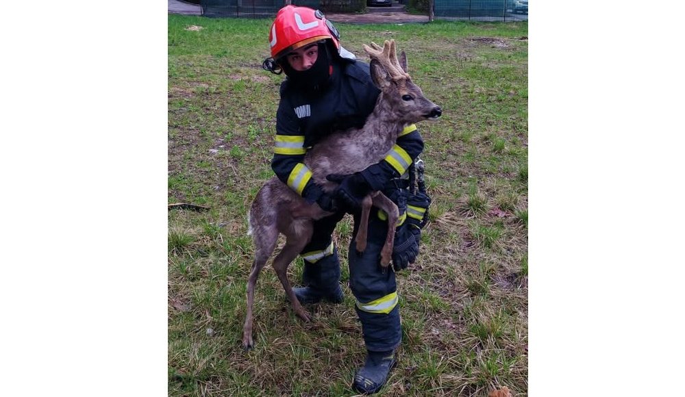 Intervenţie inedită a pompierilor braşoveni! Pui de cerb salvat, după ce a rămas prins într-un gard