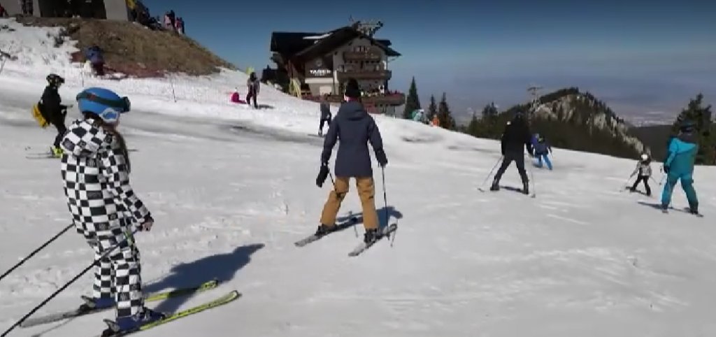 În Poiana Brașov se poate schia de sus, de pe munte, până la poale. La 13 grade Celsius și fără pic de nor, Masivul Postăvarul părea destinația ideală pentru o drumeție, dar pârtiile încă au zăpadă, așa că schiorii au dat ture până au obosit.