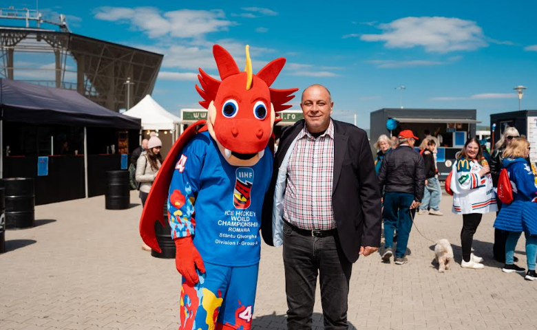 Profitând de ocazie, Laszlo Dioszegi s-a fotografiat cu balaurul Dezi, mascota competiţiei de anvergură organizată la Sfântu Gheorghe.
