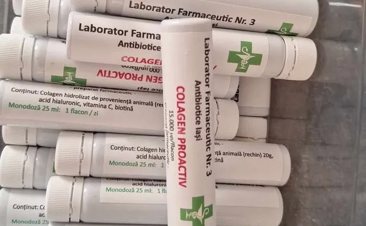 Antibiotice Iași anunță că este vorba despre produsul „Colagen Proactiv. Conținut: Colagen hidrolizat de proveniență animală (rechin) 20g, acid hialuronic, Vitamina C, biotină . Monodoză 25 ml: 1 fl/zi”.