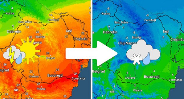 Weekend-ul începe cu furtuni și temperaturi de până la 30 de grade, dar apoi vremea se răcește brusc și vin ploi și ninsori în mai puţin de 48, potrivit Meteo&Radar.