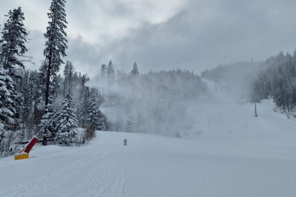 Datorită temperaturilor negative, administratorii domeniului schiabil din Poiana Brașov produs pe timpul zilei zăpadă artificială pe pârtiile din masivul Postăvarul, în zona superioară a domeniului schiabil.