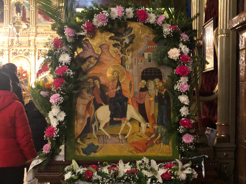 Cu doar o zi înainte, Iisus Hrisos săvârșește o nouă minune, înviindu-l pe Lazăr, care zăcuse patru zile în mormânt, ca simbol al învierii neamului omenesc.. De aceea, mulţimile strânse la porţile cetăţii L-au întâmpinat cu ramuri de măslin și de finic şi L-au aclamat pe Mântuitor, la intrarea în Ierusalim. Aceștia, văzându-L, au început să strige: „Osana! Bine este cuvântat Cel ce vine întru numele Domnului!”. Credincioșii rosteau aceste cuvinte, deoarece simțeau că Dumnezeu s-a pogorât din Ceruri și a venit pe pământ pentru a-i mântui.
