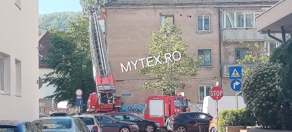 Pompierii brașoveni intervin cu o autoscară la un bloc de pe strada Iuliu Maniu (în zona Tribunalului). Din primele date, ei au fost solicitați să îndepărteze elemente de construcție care stăteau să cadă de pe bloc.