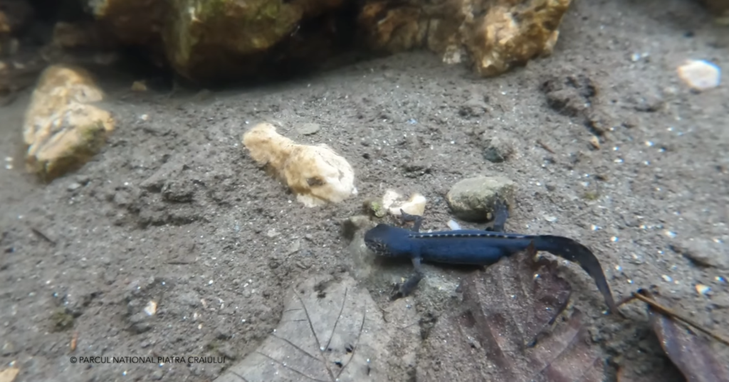 În imagine este Triton de munte – Ichthyosaura alpestris, filmat în apele de munte din parcul Național Piatra Craiului.
