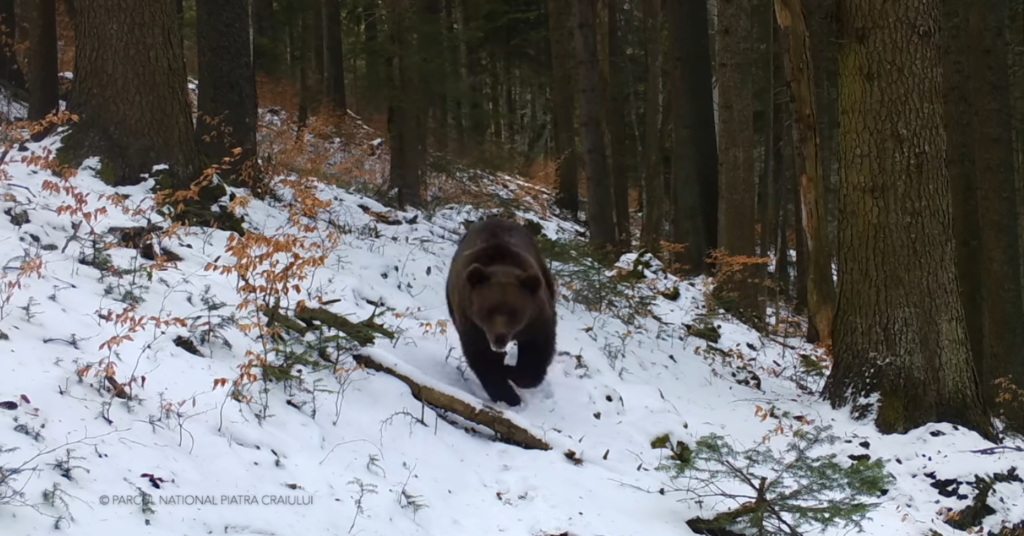 Rangerii Parcului au instalat camere de luat vederi pentru a putea urmări viața animalelor din Masivul Piatra Craiului. În filmarea de pe camerele de supraveghere a faunei pe care o prezentăm astăzi, poate fi văzut inclusiv un urs care „gonește” spre o destinație cunoscută doar de el.